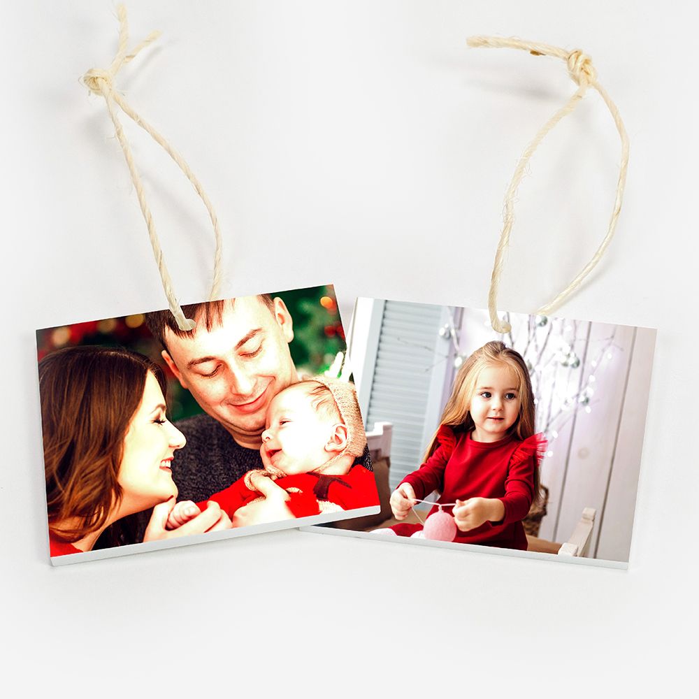 El adorno tiene un acabado blanco en la parte posterior, lo que resalta la impresión y le da un toque sofisticado. También incluye un cordón para colgar en el árbol.