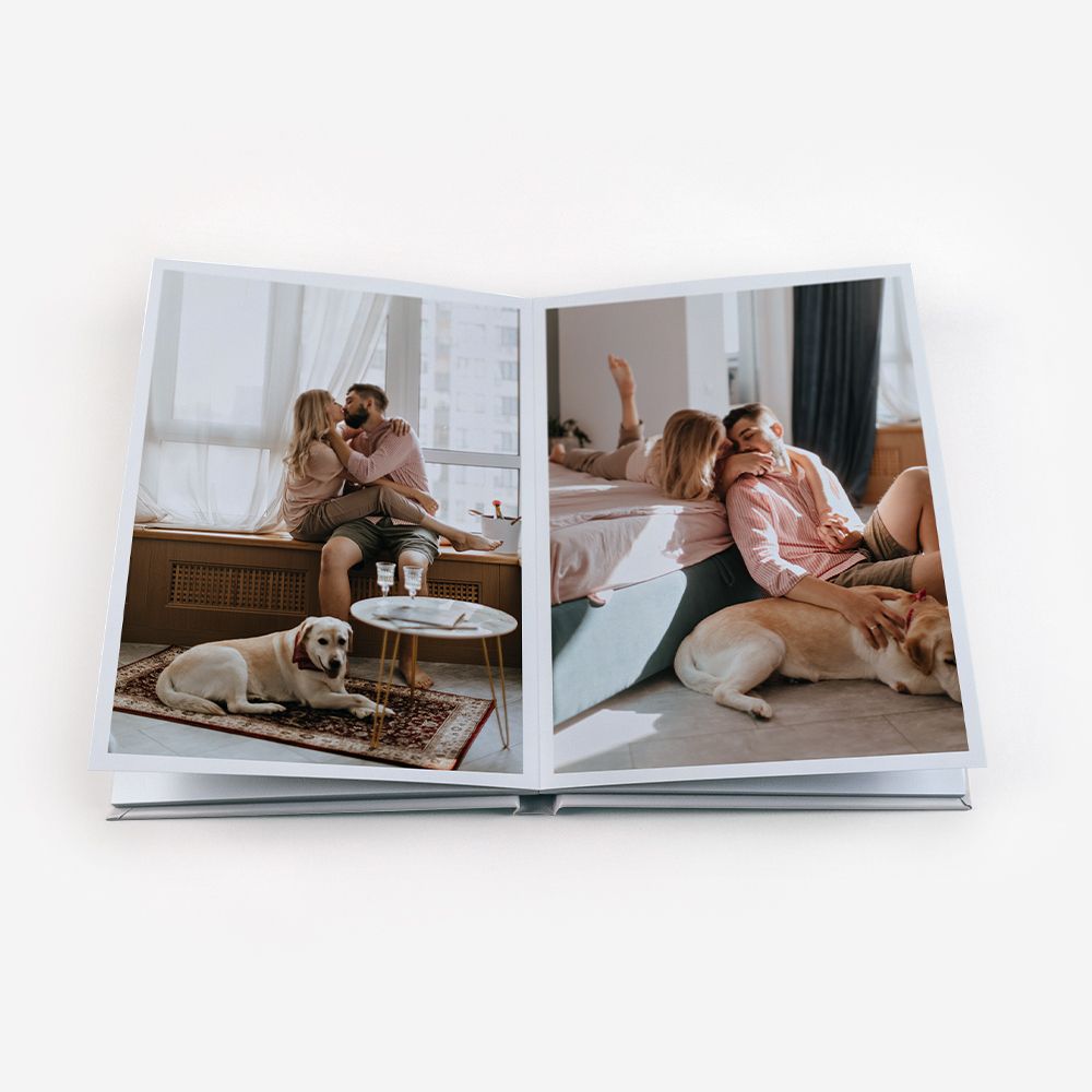 Los Álbumes de Fotos Dreambooks presentan una apertura panorámica, con la posibilidad de colocar una foto destacada ocupando dos páginas. De esta manera, disfrutarás de una visualización perfecta de tus fotos, sin cortes ni partes ocultas.