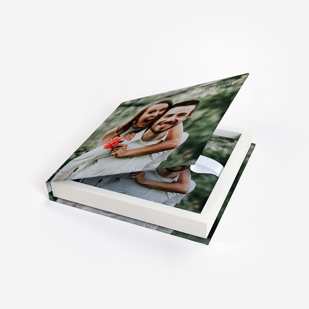 La portada rígida de cartón duro ofrece una protección adicional y un acabado elegante a tu álbum. A través de su portada fotográfica, puedes importar fotografías, textos o cliparts. Si lo deseas, también puedes replicar la portada del Álbum en la Box, creando así un conjunto perfecto.