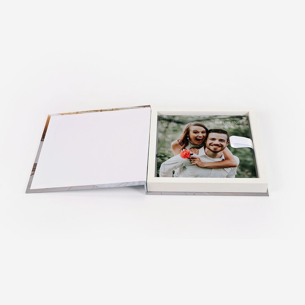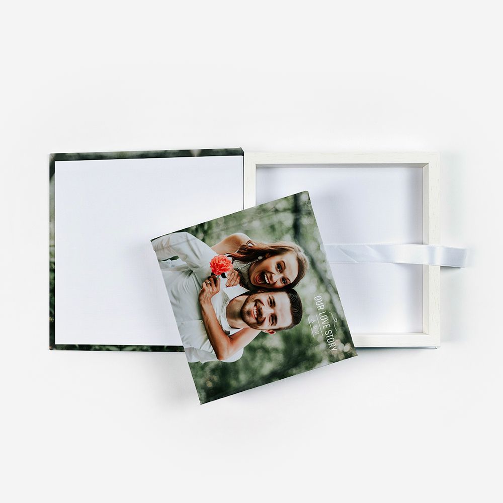 Personaliza tu Box Square como si fuera un álbum. A través de su portada fotográfica, puedes importar fotografías, textos o cliparts. Si lo deseas, también puedes replicar la portada del Álbum en la Box, creando así un conjunto perfecto.