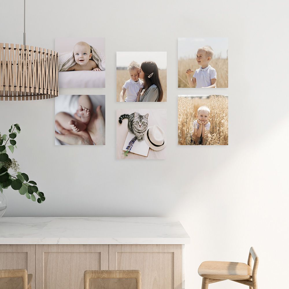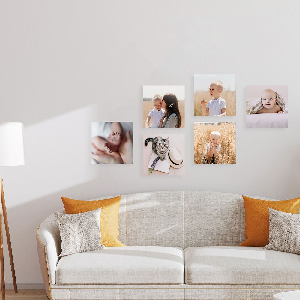 Hechos con material de alta calidad en PVC, estos cuadros son perfectos para lucir tus fotografías y frases especiales de forma vibrante y duradera, gracias a la impresión directa con tintas UV resistentes. Disponibles en el formato 20x20 cm, los Cuadros Adhesivos x UHU ofrecen versatilidad en dos composiciones: con 6 o 12 piezas.