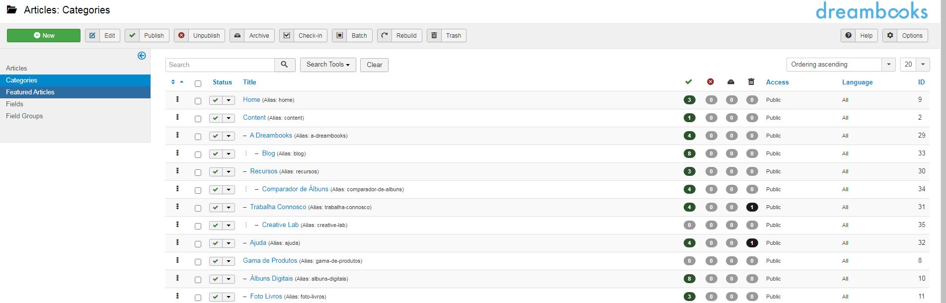 Nesta área poderão analisar/criar/editar todos os conteúdos que possam ter uma tradução associada.