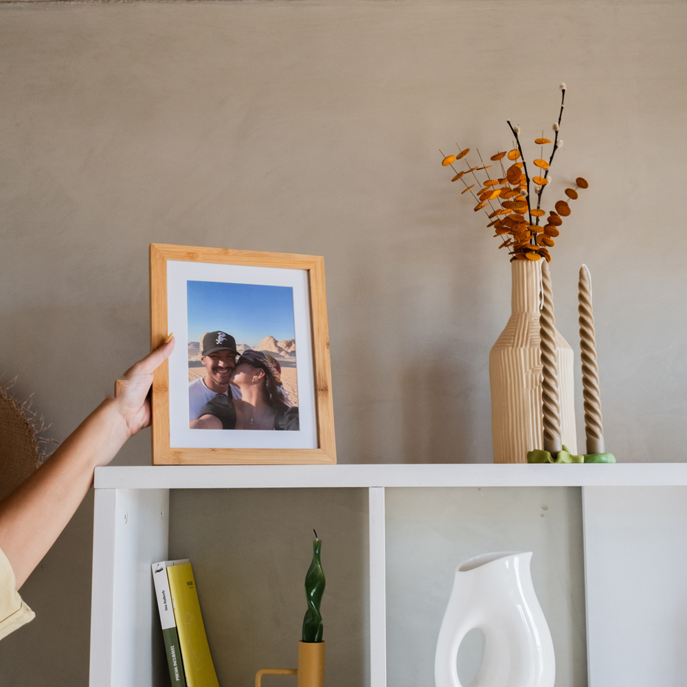 Marco de alta calidad, fabricado en madera, garantizando durabilidad y un acabado perfecto para resaltar tus fotos.