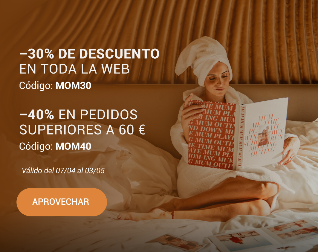 Campaña de –30% en toda la web con el código MOM30 y – 40% en pedidos superiores a 60€ con el código MOM40, válida del 07/04/2026 al 03/05/2026. No acumulable con otras promociones o códigos en vigor. No incluidos: Fotos Estándar 10×15 cm (a partir de 50 unidades), Fotos Estándar 15×20 cm (a partir de 25 unidades) y servicio Fotos 48h.